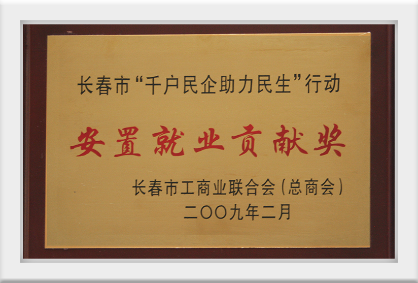 2009年2月榮獲長(zhǎng)春市“千戶民企助力民生”行動(dòng)安置就業(yè)貢獻(xiàn)獎(jiǎng)