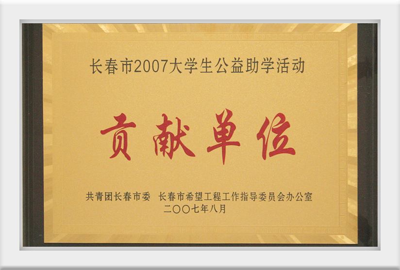 2007年8月榮獲長(zhǎng)春市2007大學(xué)生公益助學(xué)活動(dòng)貢獻(xiàn)單位