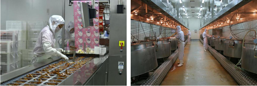 阿滿食品擁有先進(jìn)的自動(dòng)化生產(chǎn)車間,包括前處理車間、熟制車間、香腸灌制車間、油炸車間等。生產(chǎn)車間選自德國(guó)先進(jìn)生產(chǎn)線打造無菌化生產(chǎn)車間,保證產(chǎn)品質(zhì)量更穩(wěn)定;并使用行業(yè)較為領(lǐng)先的糖熏爐,糖熏爐具有優(yōu)異的發(fā)煙及循環(huán)系統(tǒng),可使?fàn)t內(nèi)的煙霧均勻分布,360度對(duì)產(chǎn)品進(jìn)行無死角熏制,從而使肉制品著色均勻,色澤美觀,保證產(chǎn)品具有較高的出品率。清洗車間引進(jìn)全自動(dòng)刷筐機(jī),機(jī)器通過熱堿水噴淋、熱水高壓噴淋以及自來水循環(huán)噴淋,三次清洗最大程度;降低油脂筐內(nèi)殘留滋生細(xì)菌。
